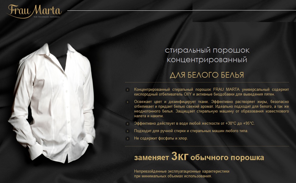 Концентрированный стиральный порошок FRAU MARTA универсальный содержит кислородный отбеливатель OXY и активные биодобавки для выведения пятен.